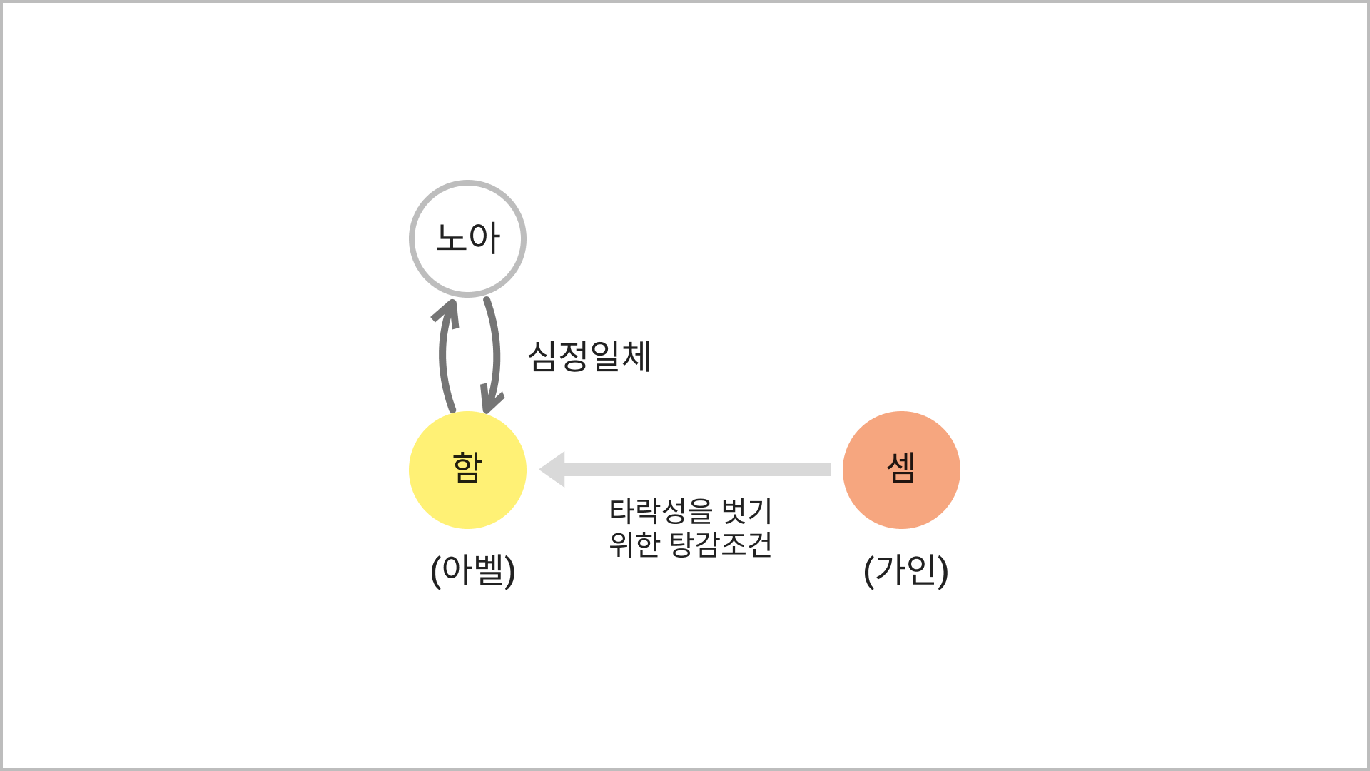 노아가 ‘상징헌제(象徵獻祭)’에 성공한 후에 이 가정의 ‘실체헌제(實體獻祭)’가 뜻맞는 것으로 바쳐지기 위하여서는, 먼저 ‘실체헌제’의 중심이 되어야 할 차자(次子) 함이 아담가정의 ‘실체헌제’의 중심이었던 차자 아벨의 입장을 복귀하지 않으면 아니 되었었다. 아담 때에는 아벨 자신이 아담의 대신으로 ‘상징헌제’를 하였기 때문에, 아벨이 그 헌제에 성공함으로써 그는 ‘믿음의 기대’를 탕감복귀하는 동시에 ‘실체헌제’의 중심으로도 결정되었던 것이다. 그러나 노아 때는 함이 아니고 노아 자신이 ‘상징헌제’를 하였기 때문에, 함이 ‘상징헌제’에 성공한 아벨의 입장에 서기 위하여는 ‘상징헌제’에 성공한 노아와 심정적으로 일체불가분(一體不可分)의 입장에 서지 않으면 아니 되었던 것이다.
