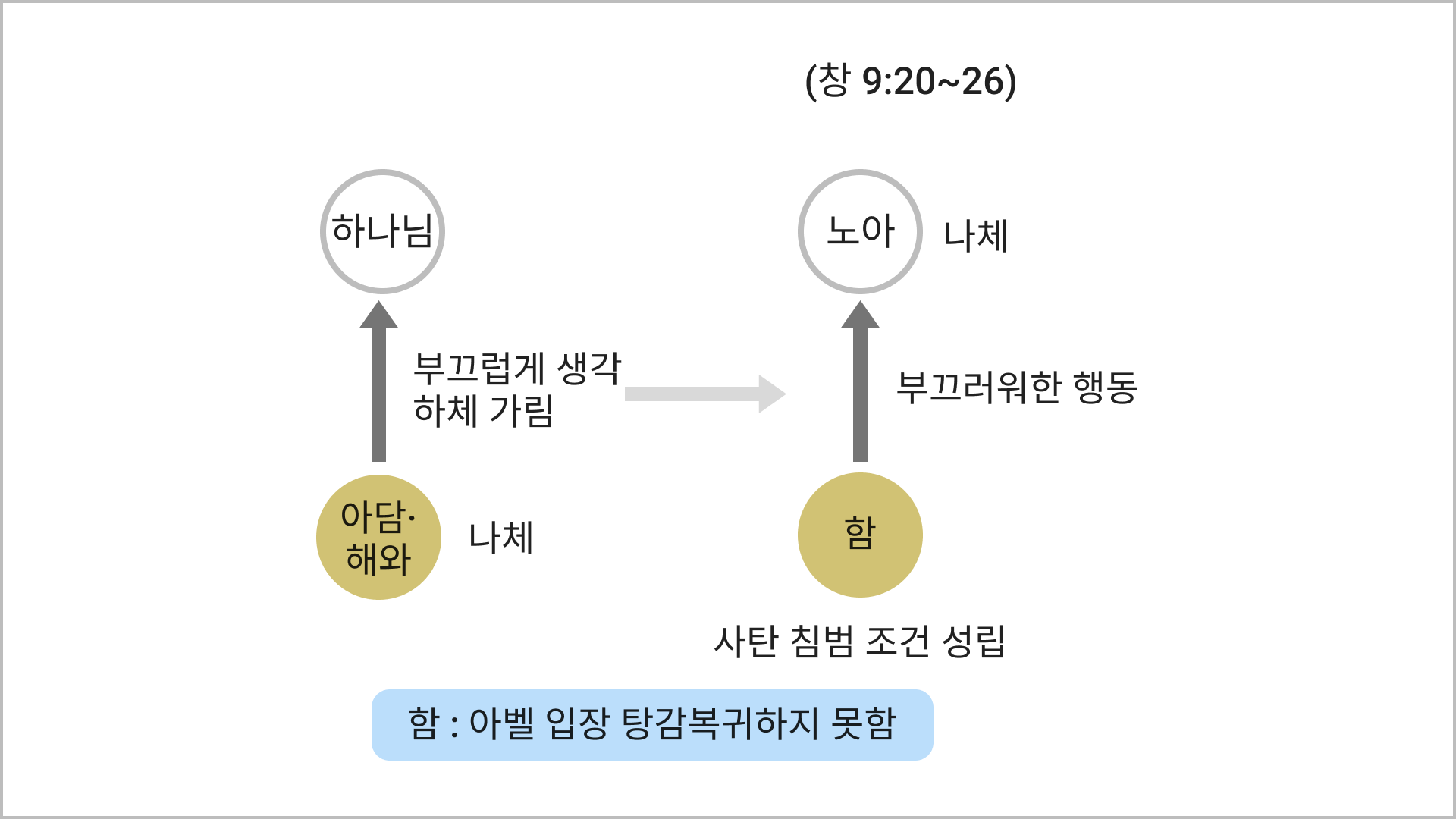 40일 심판으로 사탄을 분립(分立)한 입장에 있었던 노아는 천지창조 직후의 아담의 입장에 섰어야 했다. 이에 하나님께서는 노아가 나체(裸體)로 있어도 그 가족들이 그것을 보고 부끄러워하지 않고 또 숨으려 하지도 않는 모습을 바라보시는 것으로써, 일찍이 죄를 짓기 전 어디도 가린 데 없이 드러낸 나체 그대로의 인간을 보시면서 기뻐하셨던 그 심정을 탕감복귀하려 하셨던 것이다. 하나님은 이러한 큰 뜻을 이루시기 위하여 노아로 하여금 나체로 누워 있게 하셨었다. 따라서 함도 하나님과 같은 입장에서 하나님과 같은 심정(心情)으로 아무 부끄러움 없이 노아를 대했어야 노아와 일체불가분(一體不可分)의 뜻 가운데서 죄짓기 전 부끄러움을 몰랐던 아담가정의 입장으로 복귀하는 탕감조건(蕩減條件)을 세울 수 있었던 것이다.
