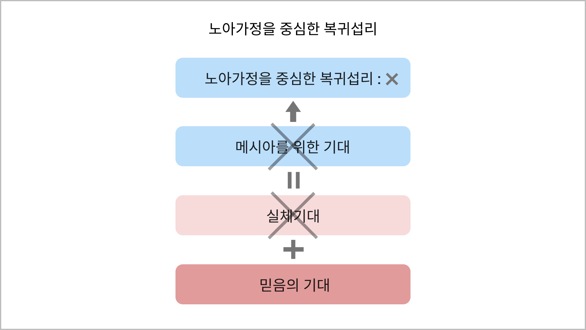 창세기 6장 13절에 모든 혈육 있는 자의 강포가 땅에 가득하므로 그 끝날이 내 앞에 이르렀으니 내가 그들을 땅과 함께 멸하리라고 하신 말씀대로 홍수심판(洪水審判)을 하신 것을 보면 그때도 말세(末世)였던 것이 분명하다. 왜냐하면 홍수심판 후 노아가정을 터로 하여 메시아를 보내심으로써 창조목적을 완성하려 하셨기 때문이다. 그러므로 노아가정도 먼저 ‘믿음의 기대’를 복귀하는 탕감조건(蕩減條件)을 세우고, 다음으로 그 기대 위에서 ‘실체기대(實體基臺)’를 복귀하는 탕감조건을 세움으로써 아담가정이 복귀하지 못하였던 ‘메시아를 위한 기대’를 탕감복귀(蕩減復歸)하지 않으면 아니 되었던 것이다.